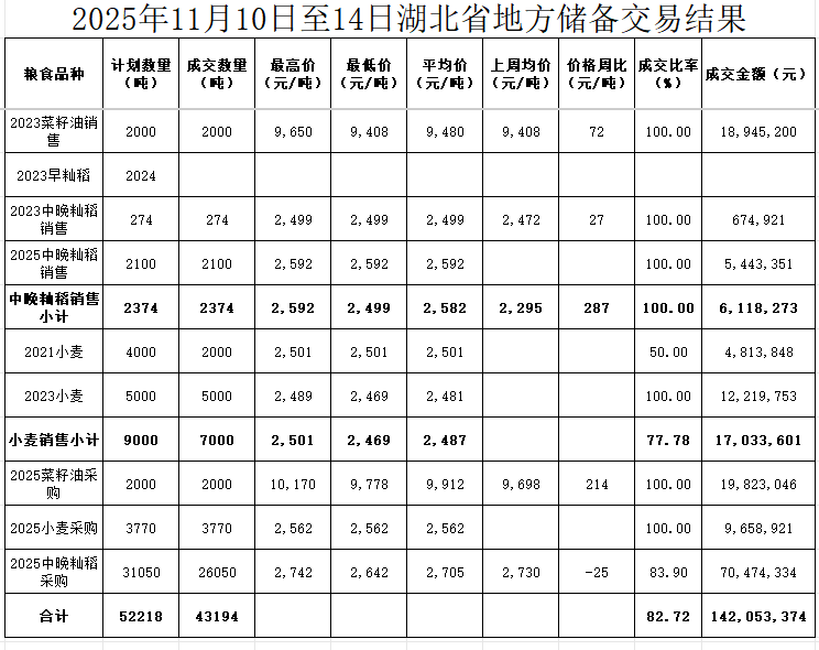 本周(2025年11101114日)湖北无国家政策性粮食投放。